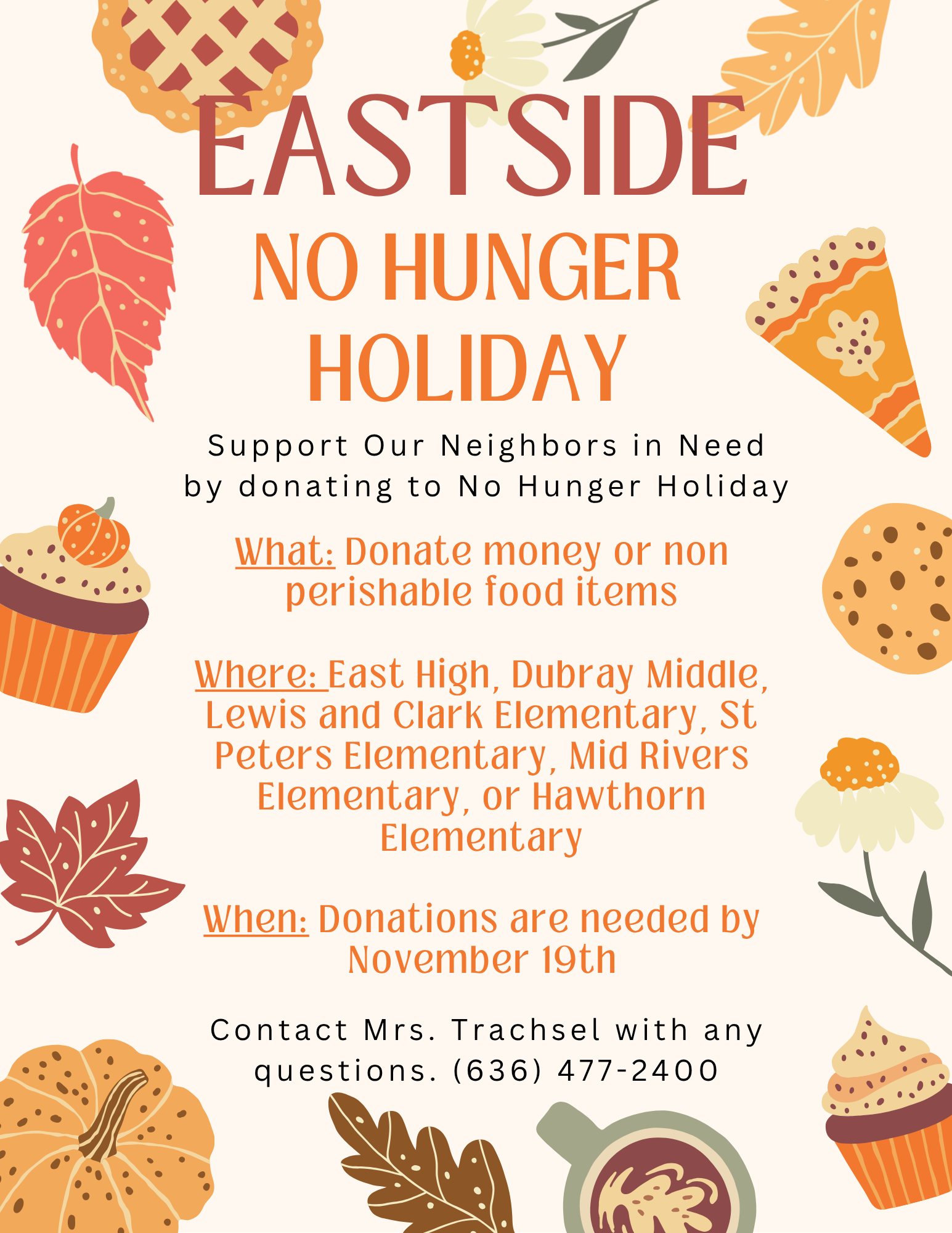 We are currently collecting non-perishable items for the No Hunger Holiday, supporting needy families in the Fort Zumwalt School District. If you would like to donate a frozen turkey, canned goods or a monetary donation, please send those items with your student or drop off at DMS. The last day of collection is November 19th.