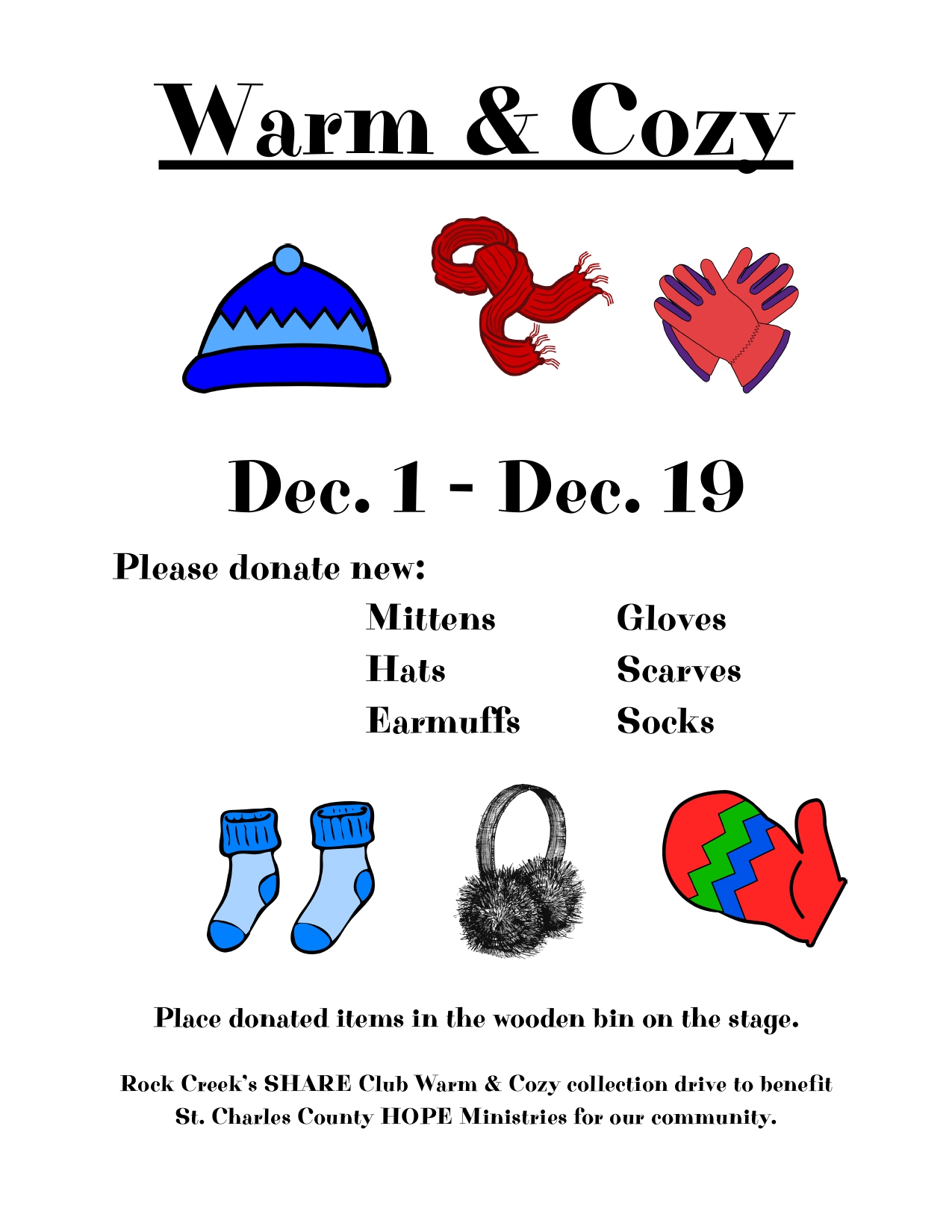Brrr, it's getting cold out there! Rock Creek's SHARE Club is on a mission to help our neighbors. We're hosting our "Warm & Cozy" collection drive to support St. Charles County HOPE Ministries.